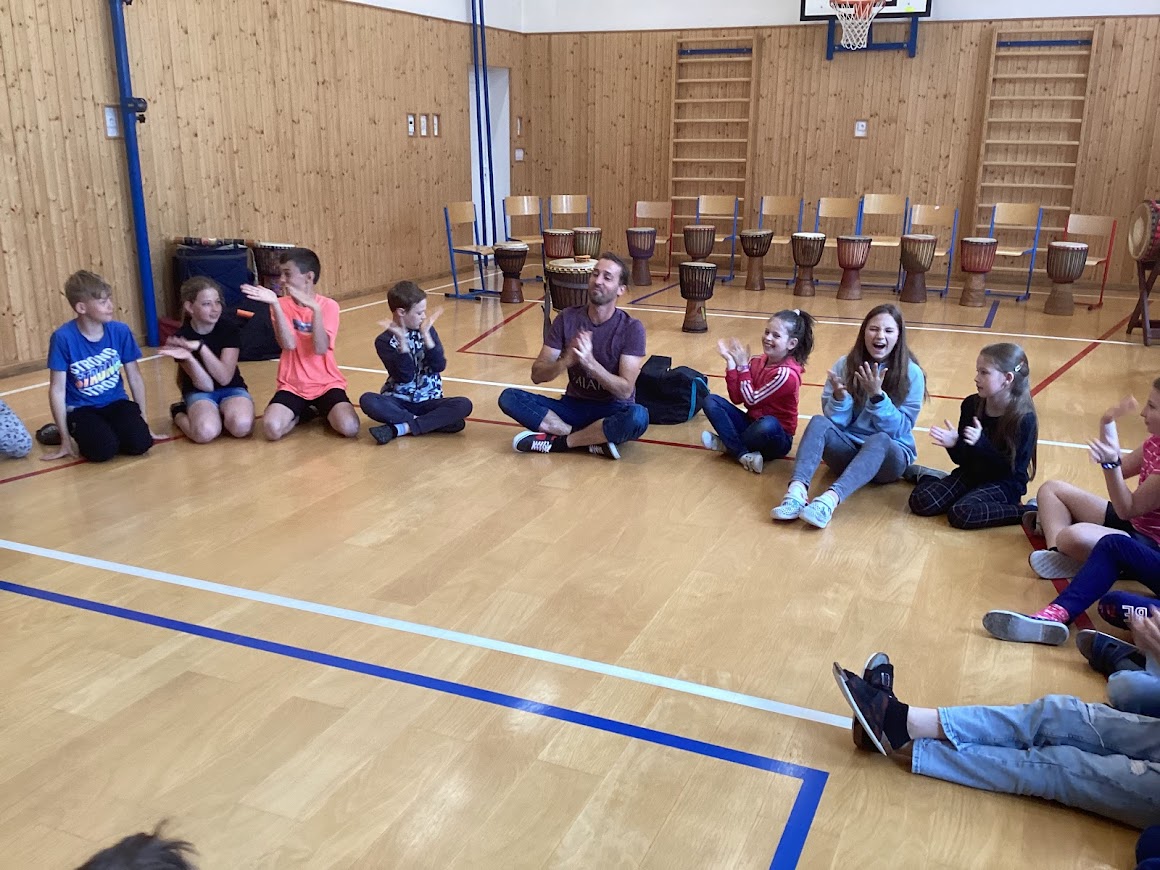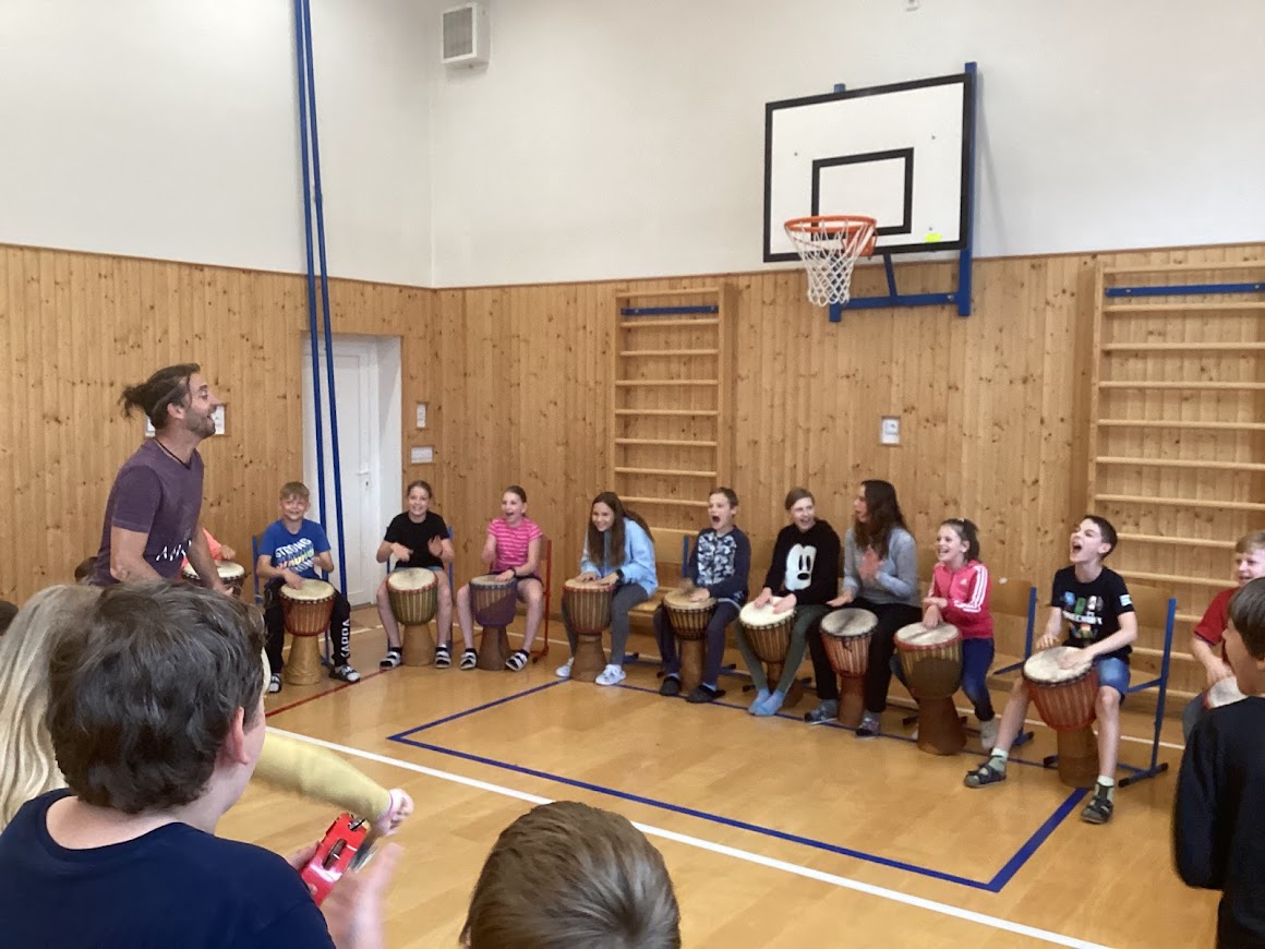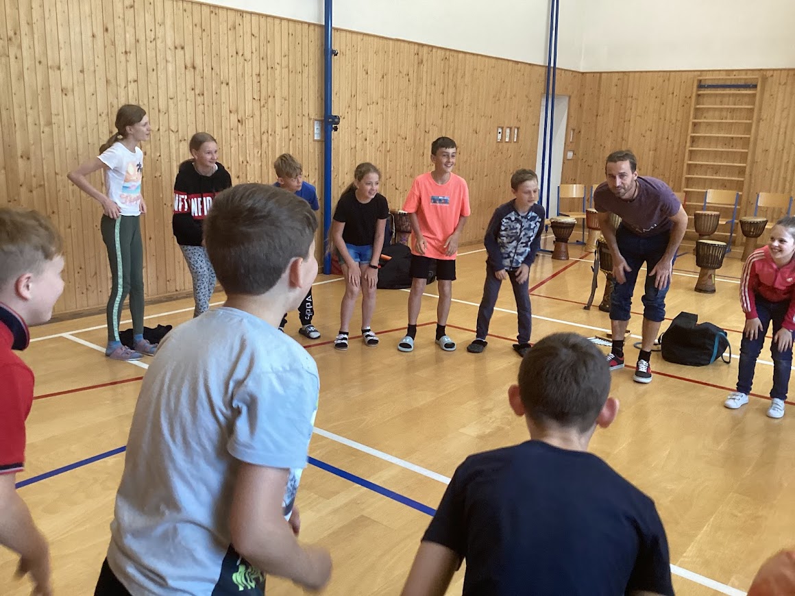 Jirka nás zavedl i mezi různé africké kmeny a vysvětlil, jak bubnování sloužilo k jejich vzájemnému dorozumívání. Sami jsme si vyzkoušeli hru na různé bicí nástroje i na drobné percusní nástroje. Za Jirkova vedení jsme vytvořili skvělou bubenickou show.