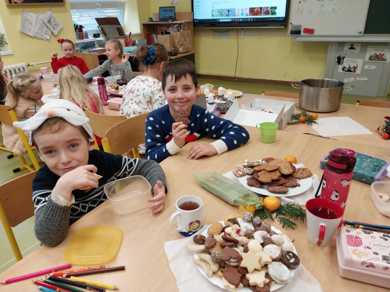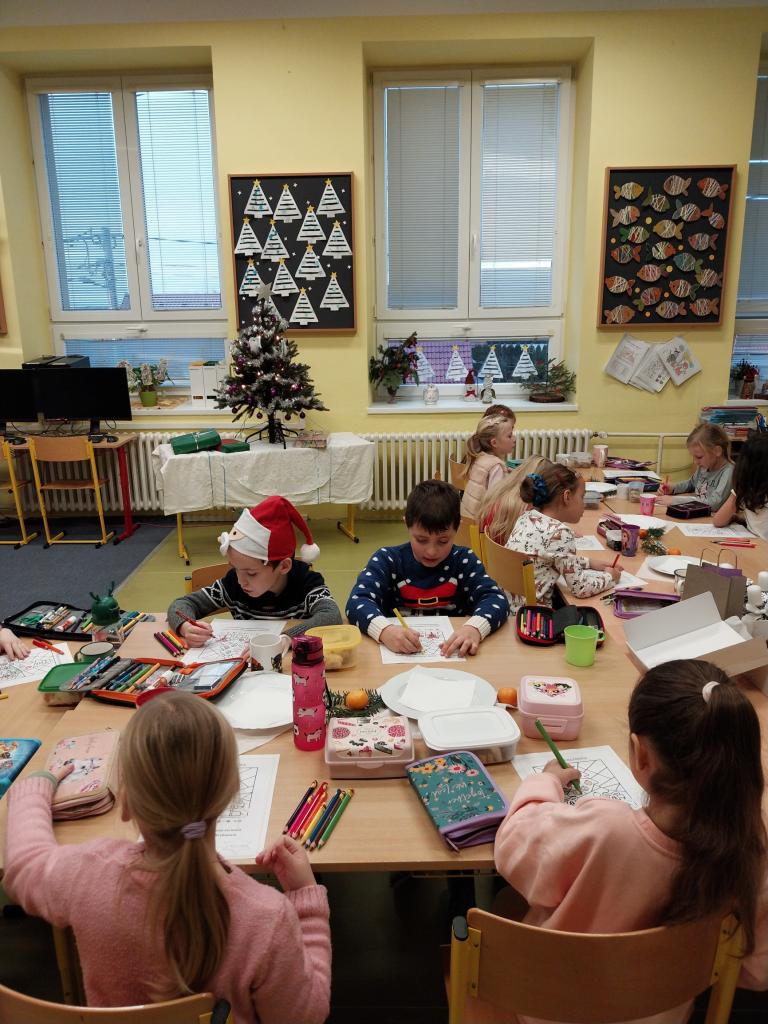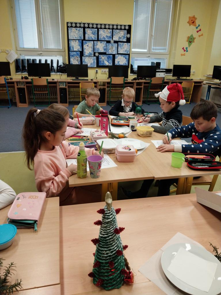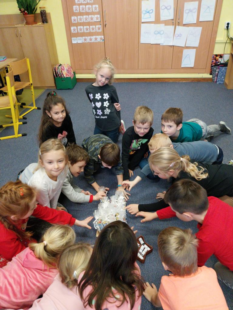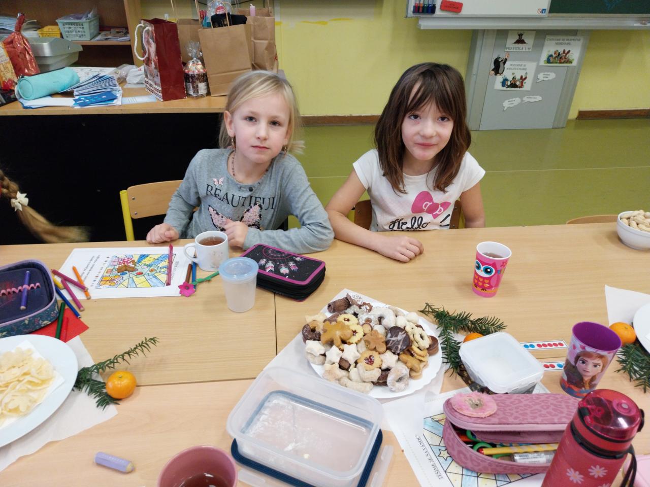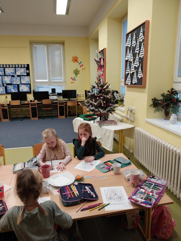 Když už Vánoce byly za dveřmi a nastal poslední den školy, uspořádali jsme si ve třídě takové malé vánoční posezení. Posezení s cukrovím, čajíčkem i drobnými dárečky. Ale učeníčko jsme nevynechali – četli jsme si, psali i počítali a něco jsme si nechali také na doma. Aby nám to čekání na Ježíška rychle uteklo. No a potom už jsme se s přáním, radostí a nedočkavostí rozeběhli do svých domovů.