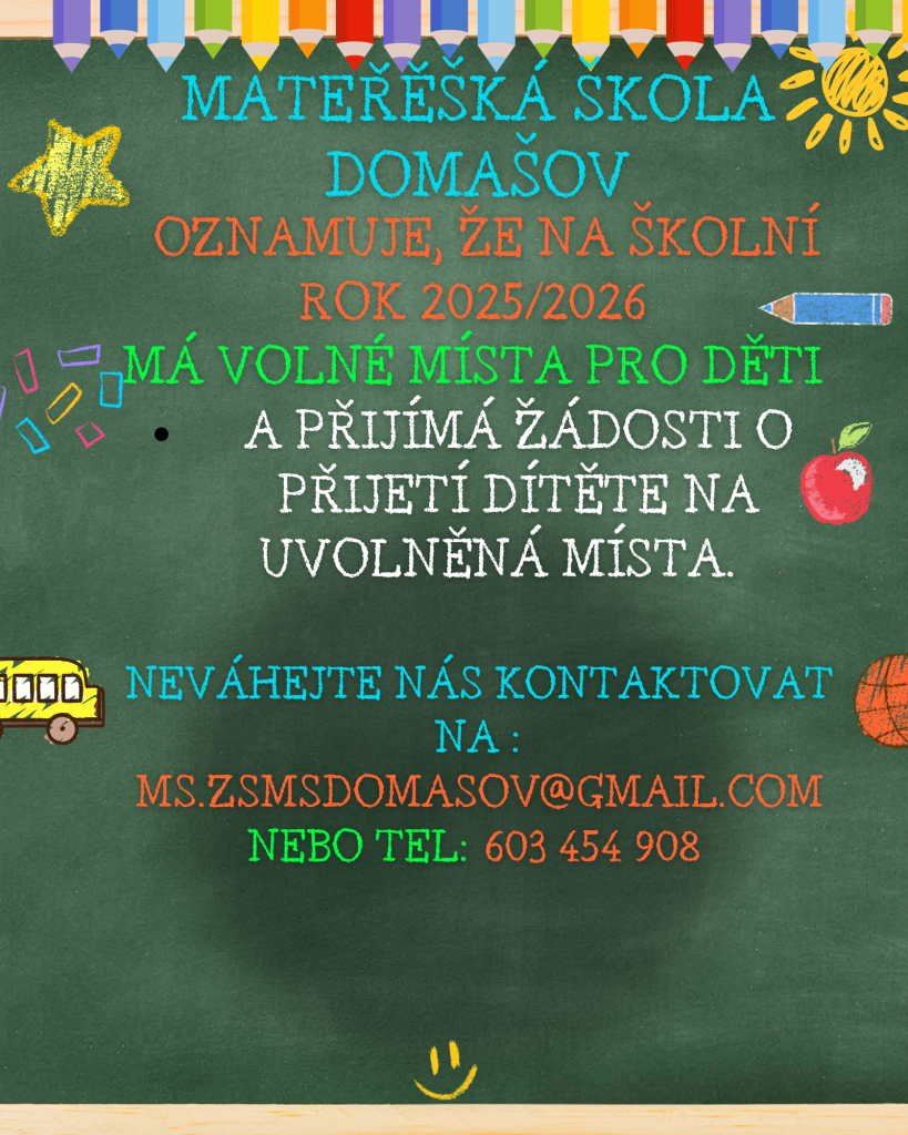 Základní škola a Mateřská škola Domašov informuje, že pracoviště Mateřské školy přijímá žádosti o přijetí dítěte na uvolněná místa. Pokud máte zájem o umístění Vašeho dítěte, neváhejte nás kontaktovat na email ms.zsmsdomasov@gmail.com nebo na tel.čísle 603 454 908.